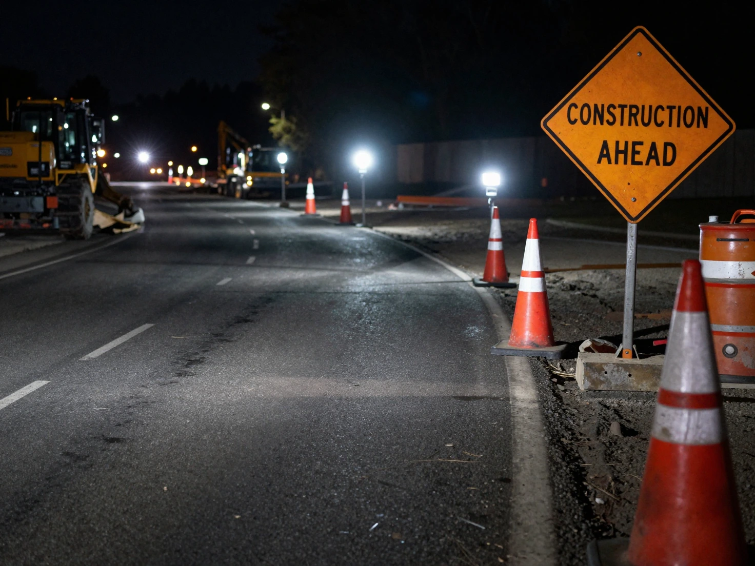 When projects involve road exposure, work zone traffic control becomes much more complex after dark. Driver perception changes under artificial lighting, and glare can significantly reduce detection distance.